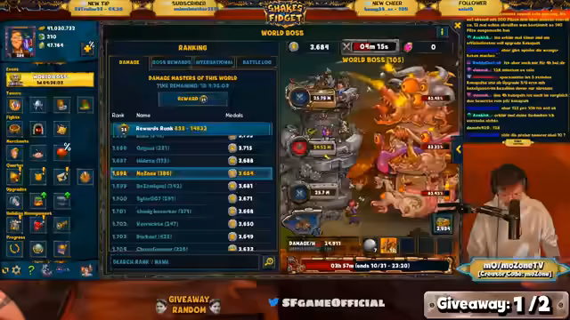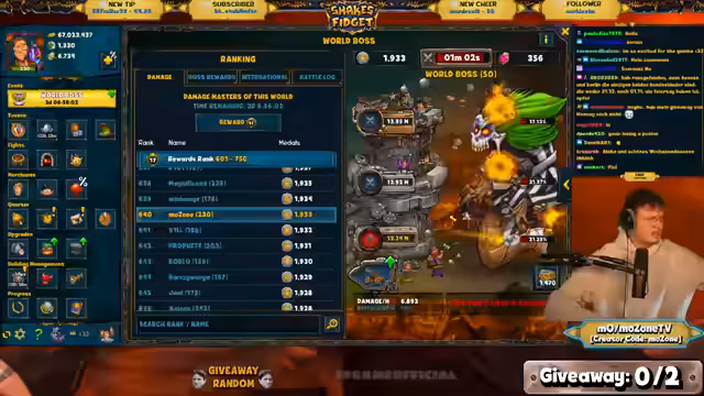 03:04:09Der Streamer zeigt aktuelle Server-Rankings für den Weltboss an und nennt die Top-Spieler auf verschiedenen Servern. Dies führt zu einer allgemeinen Betrachtung des Erfolgs und des Muschroom-Einsatzes im Spiel. Gleichzeitig gibt es eine technische Panne mit der Webcam, was den Stream kurz unterbricht und für einen humoristischen Moment sorgt, bevor es um Rankings und den weiteren Event-Verlauf geht.