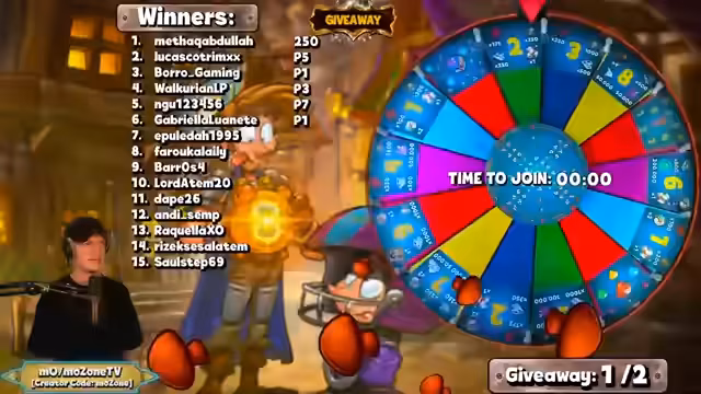 00:28:39Das Giveaway beginnt mit der Erklärung der Teilnahmebedingung: ein einmaliges Eingeben des Schlüsselworts '!Tickets' im Chat. Der Streamer beginnt das Glücksrad und stellt den ersten Gewinner Meta. Abdullah vor. Dieser muss eine Frage beantworten, wer der höchstlevelte Spieler auf EU20 ist oder welche Klasse der Gewinner des Necromancer-Avatars ist. Nach einem erneuten Reroll wird die Frage nach dem Gebäude in der Festung gestellt, das Erfahrungspunkte gibt.