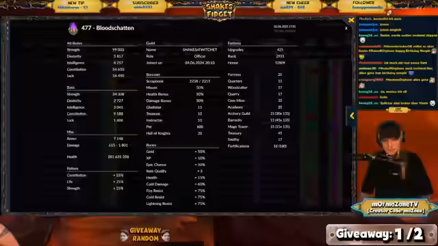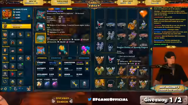 02:46:59Ein Giveaway wurde gestartet, für das die Teilnehmer sich über einen Timer im Chat registrieren mussten. Der Gewinner, 'Gangster Mo', wurde gezogen und erhielt Package 4. Währenddessen gab es technische Diskussionen über SF-Tools, das oft beim Login hängt, wenn man zwischen verschiedenen Anmeldearten wechselt. Es wurden Spielmechaniken wie Dungeon Break und der Umgang mit legendären Gegenständen und Edelsteinen erklärt. Man kann durch das Besiegen legendärer Dungeons permanente Chancen auf legendäre Drops freischalten, die dann unabhängig von Events aktiv sind.