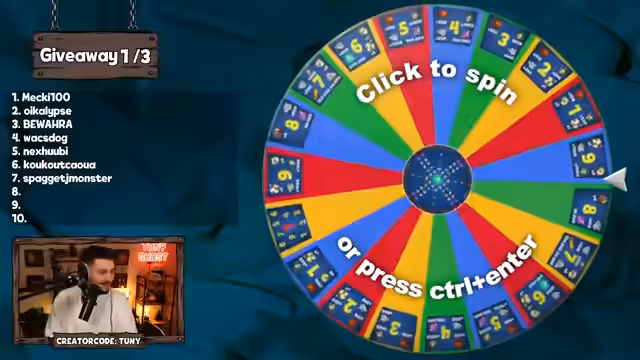 02:12:10Die Gewinner des Giveaways werden nacheinander ausgerufen und per Zufallsprinzip Paketen zugeordnet. Unter den Gewinnern sind Belzebub SF, JK Barracuda, Groovy, Dave, Gazelle, Lugas, Shakratika, Tekai, Dribbler XD und andere. Jeder Gewinner erhält ein spezifisches Paket (z.B. Paket 3, 5 oder 9). Die Gewinner werden via Twitch-DM benachrichtigt, wobei die Auslieferung möglicherweise einige Tage dauern kann.