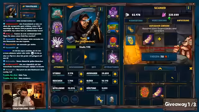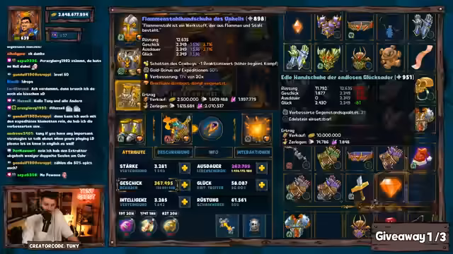 00:23:18Zu Beginn des Streams wird ein Early Bird Giveaway angekündigt. Nach dem Erstellen des Keywords 'Legendary Dungeon F9' haben Zuschauer eine Minute Zeit, um im Chat teilzunehmen. Gewinner wie Mackie und Eukalypse werden gezogen und erhalten verschiedene Pakete. Die Preise werden per Twitch-Direct-Message verschickt, können aber aufgrund von Mos Abwesenheit einige Tage Verzögerung haben.