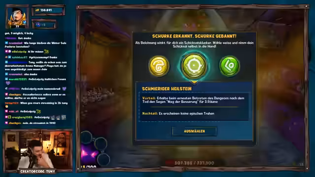 01:47:53Nach jedem Boss im Dungeon kann ein Klunker (Boni) aus drei Optionen gewählt werden. Die Auswahl ist entscheidend für den Erfolg des Runs. Schlechte Entscheidungen können den Fortschritt kosten. Der Spieler analysiert Beispiele wie erhöhte Segen-Chancen oder Schadensreduktion und erklärt, warum manche Klunker nur in bestimmten Situationen sinnvoll sind. Zudem droppen Bosse epische Items, die im Hexenkessel verwertet oder verkauft werden können. Ultimate Runs garantieren nach 20 Runs eine Waffe.