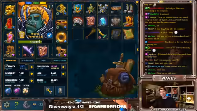 01:21:30Aufgrund der technischen Probleme wird das erste Giveaway vorverlegt. Als einfacher Schlüssel für die Teilnahme wird "!" gewählt. Während der Streamer vergeblich versucht, sich wieder einzuloggen, interagieren die Zuschauer mit dem Giveaway. Der Gewinner Nilo7 wird gezogen und muss eine simple Frage zu seiner Hauptklasse in Shakes & Fidget beantworten. Dies markiert den Beginn einer Serie von zehn Gewinnern, die alle eine individuelle Frage beantworten müssen, um ihre Preise zu erhalten.