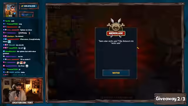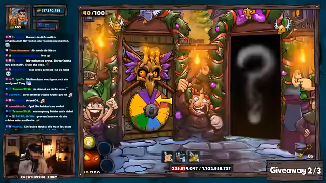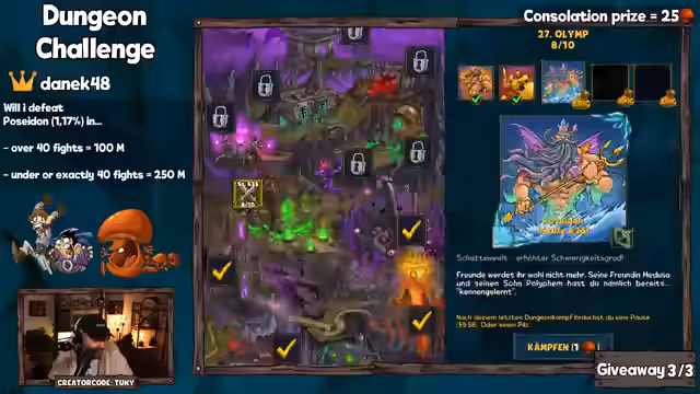 02:43:44Im letzten Giveaway-Round des Streams werden Gewinner wie Sanjevka, Barney und Alex Hany mit Paketen 2, 5 und 8 belohnt. Anschließend startet die Dungeon Challenge: Zuschauer können vorhersagen, ob der Besieger-Poseidon in über 40 Versuchen besiegt wird. Danek gewinnt die Challenge mit exakt 40 Versuchen und erhält 250 Pilze. Der Streamer kommentiert den Erfolg und die Mechaniken der Challenge.