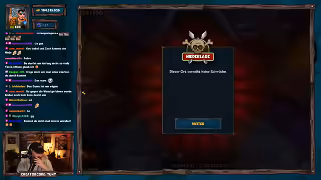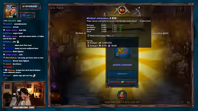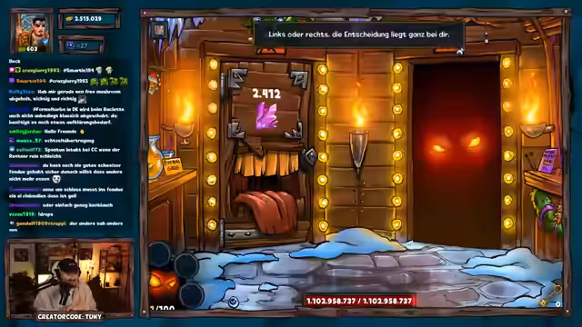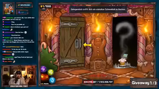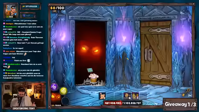 01:16:10Nach einem gescheiterten Versuch mit Fokus auf epischen Truhen startet der Streamer einen neuen Run mit optimierter Taktik: Türenöffnen zur Erzwingung besserer Segnungen. Er erklärt den Nutzen von Events wie dem Hexen-Event für effizientes Goldfarmen und erwähnt bevorstehende Dungeon-Challenges am Wochenende. Während des Runs kommt es zu einer Panne (verschüttetes Getränk), die den Stream kurz unterbricht. Giveaway-Teilnahmen werden weiterhin aktiv unterstützt, wobei der Fokus auf dem Erreichen von Raum 50 liegt.