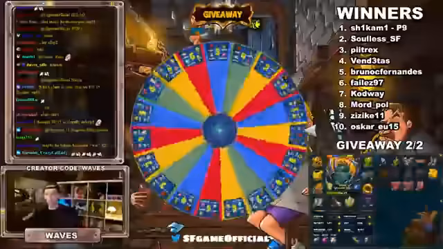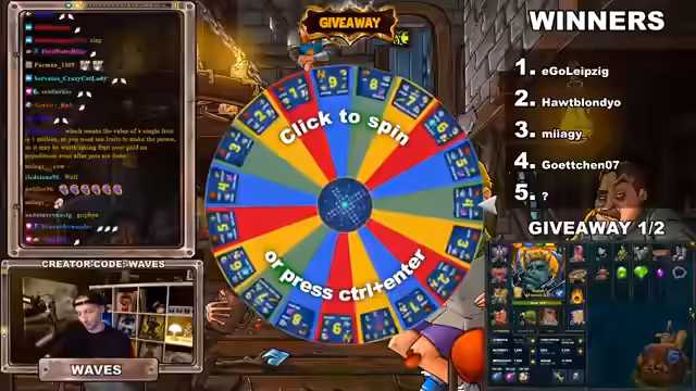 00:19:42Das erste Giveaway wird gestartet, bei dem das Keyword "!vellen gone" lautet. Nach Ablauf der Zeit werden die Gewinner bekannt gegeben: Ego, Hart Blondio, Miyagi, Götchen07 und MSKN. Jedem Gewinner wird eine Frage gestellt, um sicherzustellen, dass er anwesend ist und es sich tatsächlich um den Gewinner handelt. Ego muss seine Lieblingsfarbe nennen, Hart Blondio seinen Hauptserver in Shakes and Fidget, Miyagi sein liebstes Mount (rein vom Aussehen her), Götchen07 soll schätzen, wie lange er Shakes and Fidget spielt, und Kayan wird nach seiner Lieblingsklasse im Spiel gefragt. Nach der Fragerunde wird ein Glücksrad gedreht, um die Preise für die Gewinner zu bestimmen: Ego erhält Paket 8, Hot Blondio Paket 5, Miyagi Paket 2, Götchen07 Paket 1 und MS Cayen Paket 3.