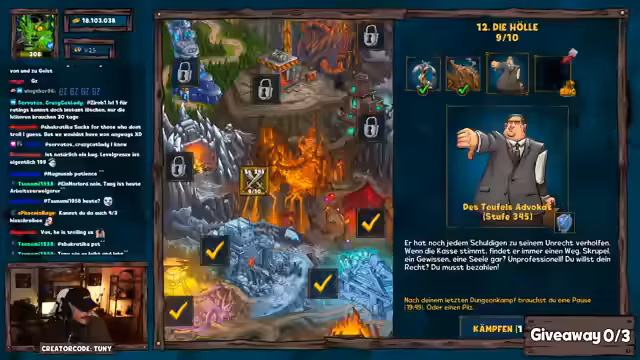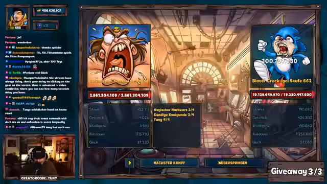 02:43:06Zum Streamende hin findet eine sogenannte Dungeon Challenge statt. Der Streamer spielt gegen den Boss Sonic und muss innerhalb von 100 Kämpfen eine Schadensschwelle erreichen, um für den Gewinner Periane einen Preis von 250 Pilzen zu erhalten. Trotz intensiver Bemühungen und guter Performance gelingt es ihm nicht, die geforderte Schadenszahl zu erreichen. Periane erhält dennoch einen kleineren Trostpreis von 25 Pilzen.