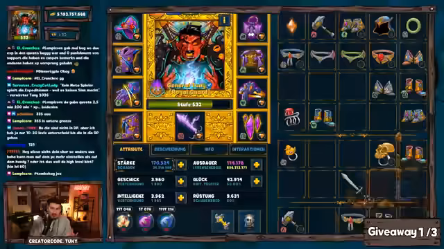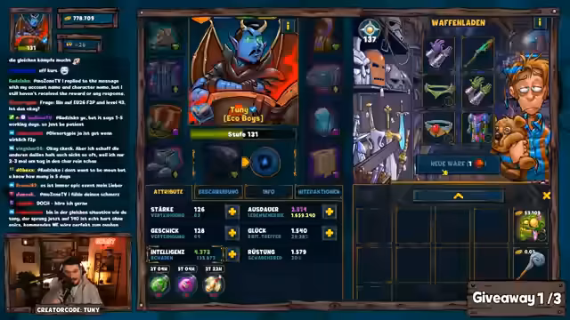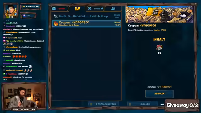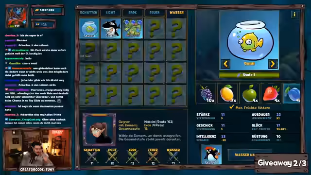 00:15:22Der Stream startet nach anfänglichen technischen Problemen mit einem fröhlichen Gruß an die Zuschauer. Der Streamer kündigt direkt zu Beginn ein Giveaway an und bittet die Chat-Teilnehmer um ihre Meinung für oder dagegen. Es wird ein Code für ein Kompensations-Giveaway im Spiel erwähnt, der bei einem Muschel-Händler eingelöst werden kann, um 15 Tickets zu erhalten. Der erste Versuch des Giveaways verläuft turbulent, wird aufgrund eines Fehlers jedoch mit einem neuen Keyword neu gestartet.