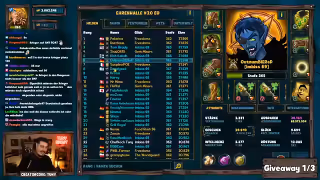 Der [game] Stream bietet Giveaways, Diskussionen über Pets (inklusive Strategien zum Leveln und Ausrüstung) und Dungeon-Strategien. Im Fokus stehen ein Sandsturm-Push, Überlegungen zum Krieger-Buff und die Dungeon Pause (DP) Strategie. Die Community diskutiert Pet-Designs und optimale Zeitpunkte für die Dungeon Pause, sowie Pet-Wege für verschiedene Elemente.
