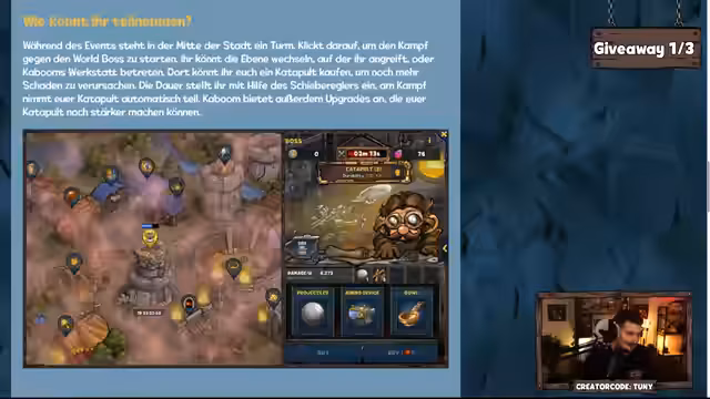 01:11:55Die grundlegende Mechanik des World Boss Events wird erläutert: Der Server greift in drei Ebenen an, und Spieler alle zehn Minuten ihre Schadensleistung über einen Katapult oder ihre Basis-Stats beitragen. Das Gameplay wird als zwanghaft und monoton beschrieben, da man sich regelmäßig für Ebenen einschreiben muss, ohne sofortige Belohnung. Im Vergleich dazu steht das tägliche Elevator-Event, das als entspannter empfunden wird, trotz seiner klickintensiven Natur.