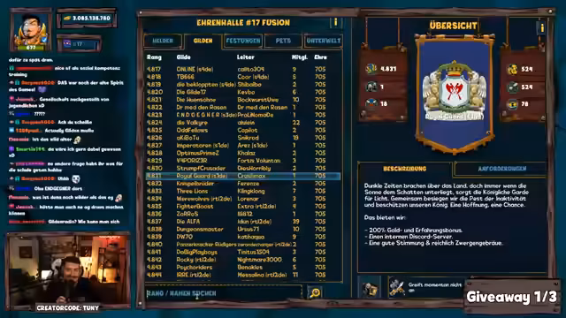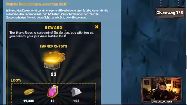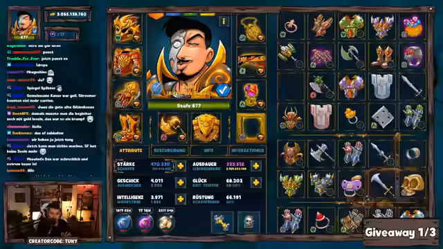 02:31:17Nachdem die Themen des Streams ausgeweitet wurden und die Diskussion sich in verschiedene Richtungen bewegte, kündigte der Streamer zwei aufeinanderfolgende Giveaways an. Nach einer zufälligen Verlosung mit Keywords und klaren Zeitfenstern für die Chat-Teilnehmer wurden mehrere Gewinner für verschiedene Pakete bekannt gegeben. Den Höhepunkt bildete eine spontane Dungeon Challenge, bei der der Teilnehmer Machai den Auftrag erhielt, einen Boss mit einer 0,3-Prozentigen Kritischen Treffer-Chance in genau 170 Kämpfen zu besiegen, was ihm einen Gewinn von 100 Pilzen einbrachte.