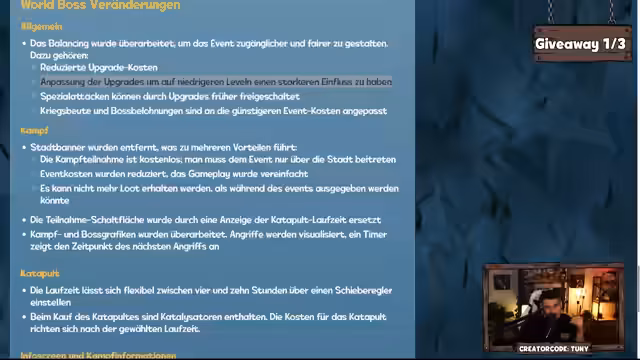 00:36:05Ein neuer Blogpost über das kommende World-Boss-Event wird im Stream vorgestellt. Der Streamer geht detailliert auf die überarbeiteten Event-Features ein. Die größten Änderungen sind die Entfernung der Stadtbanner, sodass jeder Spieler teilnehmen kann, und die kostenlose Teilnahme. Es werden Katalysatoren ersetzt und Katapult-Upgrades sind nun günstiger. Außerdem gibt es neue Truhen, wie eine 'Killstealer-Truhe' und eine 'Einzeltreffer-Truhe', die mehr Transparenz schaffen.