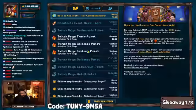 00:30:42Der Streamer erklärt ausführlich die Funktionsweise von Twitch Drops für Shakes and Fidget. Wichtig ist, dass das Twitch-Konto mit dem SF-Spielaccount verbunden sein muss. Die Drops, die man im Twitch-Shop freischaltet, erscheinen als Systemnachricht im Spiel-Postfach und können dort abgeholt werden. Anschließend wird das Thema des Inventar-Managements erörtert. Es wird dringend davon abgeraten, Items mit Basis-Stats zu zerlegen, da diese permanent sind und einen Charakter langfristig stärker machen als verbessernde Gegenstände.