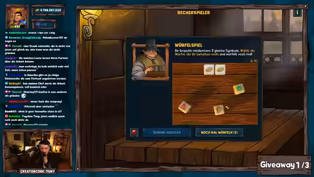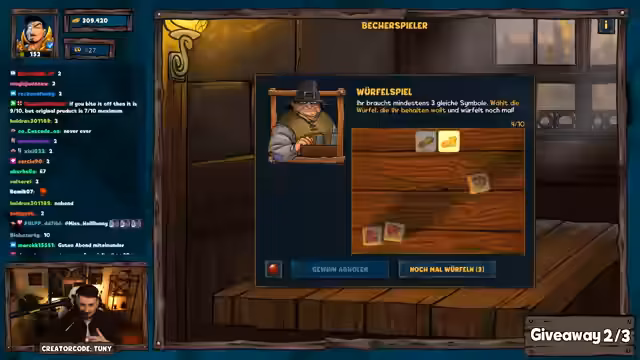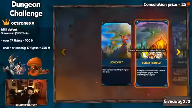 02:21:24Nachdem der Streamer es nicht schafft, das Herz der Unterwelt zu bekommen, startet er eine Dungeon Challenge. Teilnehmer wetten mit dem Keyword 'Underworld without Tunie', ob er den Salesman besiegen kann. Oktronex gewinnt die Wette, indem er unter 17 Kämpfen den Salesman besiegt und erhält 500 Pilze. Der Streamer gratuliert und kündigt an, dass der Pott im nächsten Stream wieder bei 250 startet.