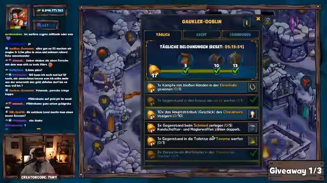 00:15:56Der Stream beginnt direkt mit einem Giveaway für die Zuschauer. Als Early-Bird-Aktion ist der Schlüsselwort-Eintrag sofort aktiviert und mit einem 60-Sekunden-Timer befristet. Der Streamer möchte alle Zuschauer persönlich begrüßen, startet aber zunächst mit der Verlosung. Die ersten Gewinner, Sinjin AP, Athenia und Trouble Forever, werden bekannt gegeben und erhalten ihre Preise, die hauptsächlich aus Kristallen und Lucky Coins bestehen. Der Ablauf des Giveaways wird als fair und unkompliziert beschrieben, wobei die Gewinner per Direktnachricht informiert werden.