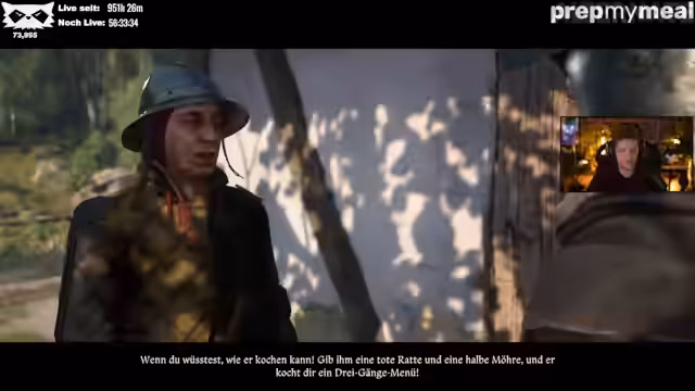 02:00:02Während seiner Zeit im Lager erwirbt der Streamer die Fähigkeit der Geburtshilfe. Diese kommt unmittelbar zum Einsatz, als er von Victoria gebeten wird, ihr bei der Geburt ihres Kindes zu helfen, nachdem sie aus Angst vor den Dorfbewohnern geflüchtet ist. Der Streamer übernimmt die Rolle der Hebamme und führt die Entbindung durch, die unter dramatischen Umständen erfolgreich verläuft und Victoria eine neue Familie in der Lagergemeinschaft sichert.