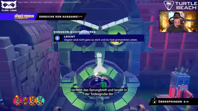 02:42:24Es wird beschlossen, einen ersten Dungeon zu spielen und diesen später mit einem anderen Spieler zu wiederholen. Die Gruppe entscheidet sich für einen Jump'n'Run-Dungeon, da Rätsel als schwierig eingeschätzt werden. Es wird das Ziel von 20.000 Dollar für einen Goldpokal erwähnt und die Notwendigkeit, nicht zu sterben, da es Teamleben gibt. Im Dungeon werden Schlüssel gesammelt und in Schlösser geworfen. Die Dungeon-Arten variieren von Jump'n'Run bis zu kombinierten Varianten. Kronen sind wichtig für das Sammeln von Gold am Ende. Es wird ein Geheimgang entdeckt, der zwei Spieler gleichzeitig benötigt, um ihn zu aktivieren. Durch das gleichzeitige Aktivieren werden Punkte freigesetzt.