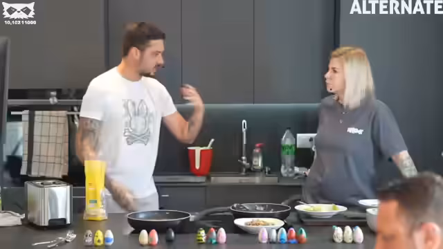 10:10:58Die Küche wird zum Schauplatz eines chaotischen Kochperiments. Während einige Teammitglieder versucht sind, die Pommes und Currywurst perfekt zuzubereiten,Others führen parallel Gespräche oder werden von Telefonaten abgelenkt. Es kommt zu absurden Situationen, bei denen während des Kochens durchgehend Gelächter und Kommentare stattfinden. Die Küchenutensilien wie Grillzangen oder Pfannen werden intensiv genutzt und diskutiert, wobei über Effizienz und Ergebnisse gestritten wird.