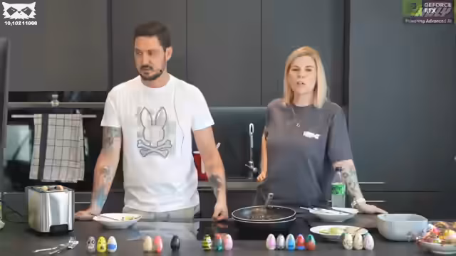 10:08:22Der Streamer und sein Team experimentieren mit der Zubereitung einer Currywurst und Pommes im Rahmen des OSTEREVENTS. Zuerst wird die Currysoße zubereitet, indem Currypulver, Cola und Ketchup kombiniert werden. Die Pommes werden im Airfryer zubereitet, wobei die Teammitglieder über optimale Zeit und Temperatur diskutieren. Nach ersten Problemen mit der Textur der Pommes wird beschlossen, sie stattdessen in der Pfanne zuzubereiten. Während des Prozesses wird humorvoll über die Kochkünste der Beteiligten gelacht und verschiedene Zubereitungsmethoden ausprobiert.