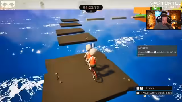 02:43:19Der Streamer startet ein Koop-Spiel namens 'Try to Drive', bei dem er mit Goyke Fahrrad fährt. Er steuert das Fahrrad und Goyke gibt Gas. Die Koordination stellt sich als schwierig heraus. Der Streamer muss ständig anhalten, zurückfahren und springen, während Goyke Gas gibt, was zu unzähligen Fehlversuchen und Stürzen in das Wasser führt. Die Kommunikation zwischen den beiden ist holprig und führt zu ständigen Missverständnissen und Frust.