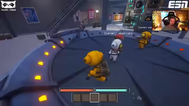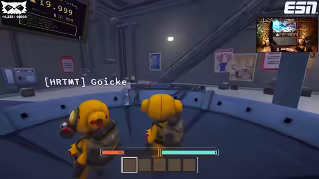 03:32:38Es treten technische Probleme mit dem Ingame-Voice-Chat auf. Ein Spieler findet ein episches Radio. Es wird versucht, das Radio zum Portal zu bringen, aber es ist schwer zu finden. Die Spieler einigen sich darauf, zum Portal zurückzukehren, obwohl nicht alle gehört werden können. Es wird festgestellt, dass ein Spieler riesig ist, weil er ein Item mit lila Umrandung hat, das ihm auch das Fliegen ermöglicht. Es wird beschlossen, die lila Sachen nach oben zu bringen, um den nächsten Raum freizuschalten.