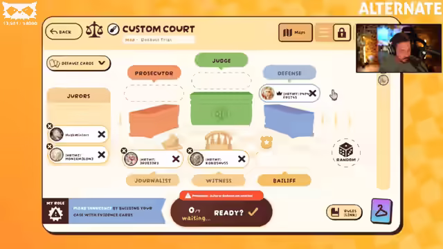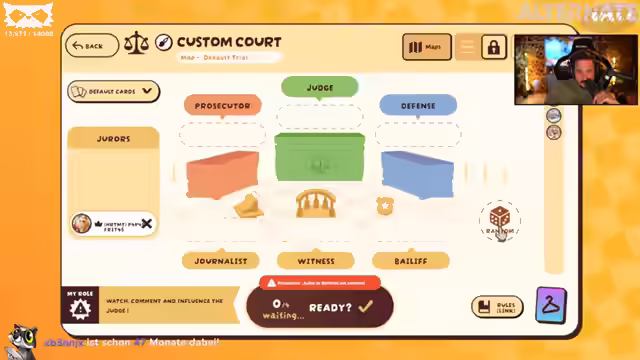01:42:26Der Anwalt gesteht, den Mandanten zu der Tat angestiftet zu haben und plädiert ebenfalls auf "schuldig". Die Jury im Twitch-Chat ist überwiegend für schuldig, aber der Richter ist für unschuldig. Es folgt eine Diskussion über die Stärken und Schwächen der Verhandlung. Der Streamer fragt, ob Goike auch den Code für das Spiel bekommen soll. Es wird über die Rollenverteilung für eine weitere Runde diskutiert, wobei verschiedene Teilnehmer die Rollen des Richters, der Jury, des Journalisten, der Verteidigung und der Anklage übernehmen. Es wird erklärt, dass die Jury Schilder hochhalten kann, um ihre Meinung zu zeigen. Die Regeln des Spiels werden im Chat geteilt. Es gibt die Option, den Saal zu ändern, z.B. in ein Klassenzimmer oder ein Königreich.