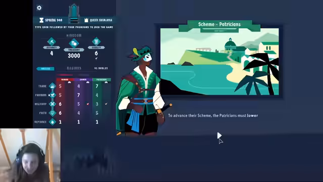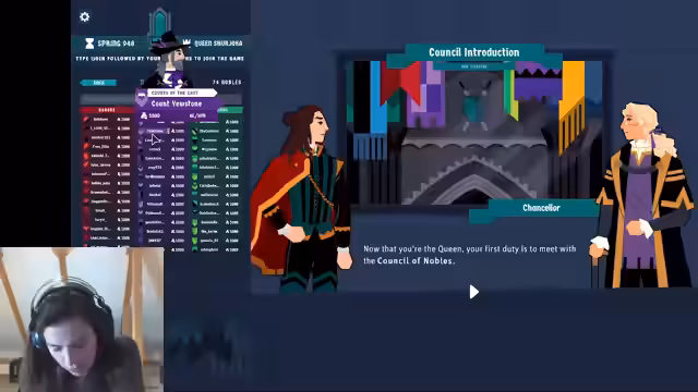 02:55:02Das Spiel 'King of the Castle' beginnt mit einem Tutorial. Der Streamer stellt die Statistiken vor: 3000 Treasury, 5 Autorität, 5 Stabilität. Die Regionen Coast (Handel), East (Landwirtschaft) und March (Militär) werden erklärt. Der Streamer interagiert mit dem Chat, der in den Regionen eingeteilt ist. Es folgt eine Einführung in den 'Path to Victory' und die Begegnung mit dem Rat der Adligen.