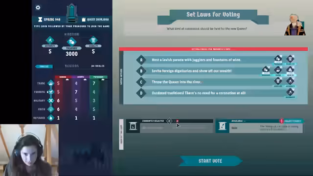 03:08:10Der Streamer trifft Entscheidungen im Spiel, darunter die Ernennung eines Lieblingsadligen und die Abstimmung über die Krönungszeremonie. Trotz der Erwartung einer absoluten Macht muss der Streamer Entscheidungen mit dem Rat abstimmen. Die Abstimmung führt zu einer ungewollten Taufe in einem Fluss, was die Stabilität erhöht, aber die Autorität senkt. Der Streamer zeigt sich überrascht und leicht frustriert über den Verlauf.