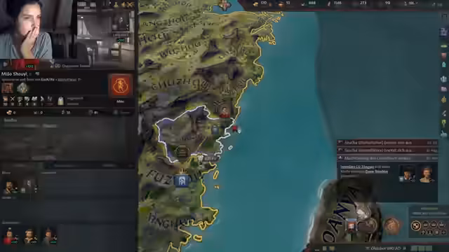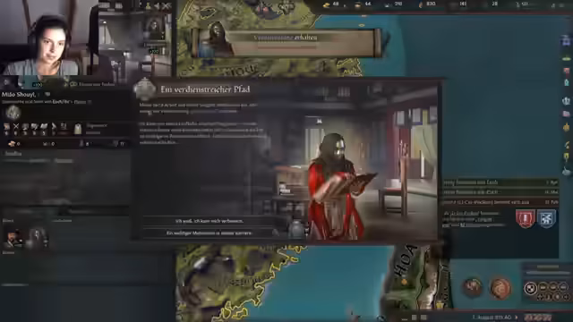 00:48:44Nach technischen Anpassungen startet die Streamerin Crusader Kings 3 mit dem neuen DLC in China im Jahr 867. Sie entscheidet sich für eine Frau als Herrscherin, trotz der im Spiel implementierten patriarchalischen Strukturen, und plant, ein Matriarchat zu etablieren. Nach Charaktererstellung (mit Diskussion über Frisuren und Kulturausrichtung) startet der Run. Die Streamerin erklärt neue Mechaniken wie den Dynastie-Kreislauf, Bewegungsmacht und Zöglinge. Sie übernimmt eine Provinz in der Rangliste (Platz 242/242) und beginnt mit Verwaltungsaufgaben, darunter die Anwerbung eines Mentors (Ältesten) und Heiratsüberlegungen für kluge Nachkommen. Sie plant, den Fokus auf Bildung und Verwaltung zu legen und erkundet die neuen DLC-Inhalte wie Bürokratiesysteme und Teegärten.