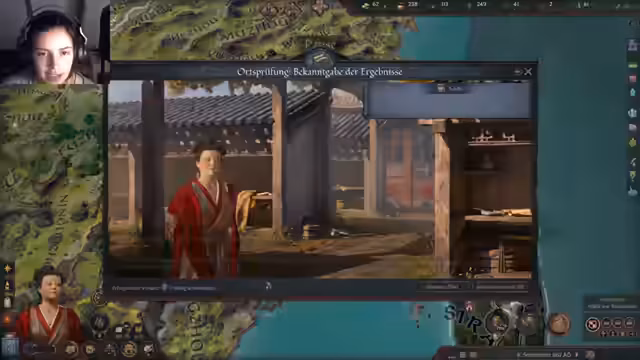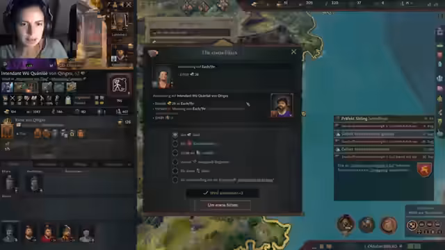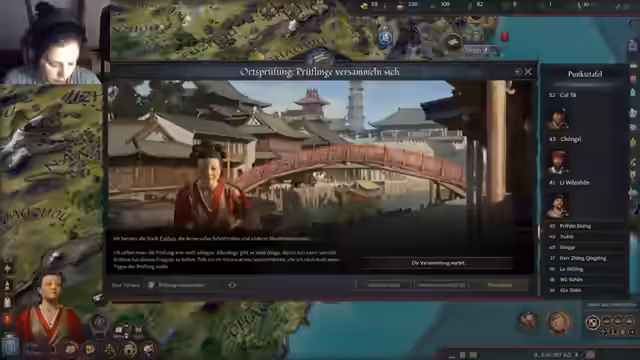 00:58:35Die anfängliche Euphorie über den China-DLC weicht schnell der Konfrontation mit seiner extremen Komplexität. Der Streamer schlüpft in die Rolle eines Präfekten in China und stößt auf ein überwältigendes System aus Prüfungen, Adelsrängen, Verwaltungsaufgaben und Dynastie-Epochen. Die Interaktion ist sehr detailreich und fordernd. Sie erkennt schnell, dass ihre Familie die mit Abstand niedrigste Rangstufe hat und fühlt sich durch die vielen Bildungs- und Verwaltungsaspekte völlig überfordert. Das Gefühl, in einem riesigen Lese-Simulator gefangen zu sein, macht sich breit, während versucht wird, die ersten Schritte in der neuen, komplizierten Bürokratie zu finden.