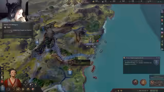 01:32:07Im Spiel hat sich der Streamer der politischen Bewegung der 'Bewahrer' angeschlossen, die für die Bewahrung alter Traditionen und die Stärkung der mächtigen Familien eintritt. Diese Entscheidung wird als paradox und als 'CDU-Cosplay' beschrieben, da die Spielerfigur als weibliche Herrscherin traditionell patriarchal Strukturen bricht, obwohl sie für deren Erhalt eintritt. Der Beitritt zur Bewegung hat einen spürbaren positiven Effekt auf die persönliche Bewegungsmacht der Figur, bringt aber auch repressive und rückschrittliche Konsequenzen für die Verwaltung des Reiches mit sich.