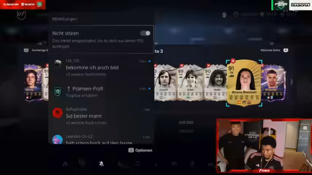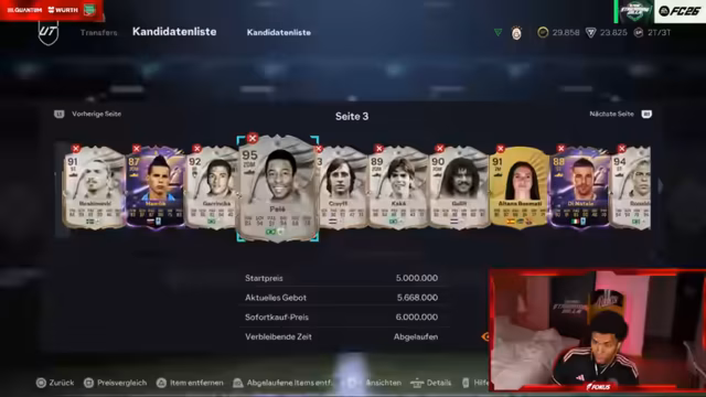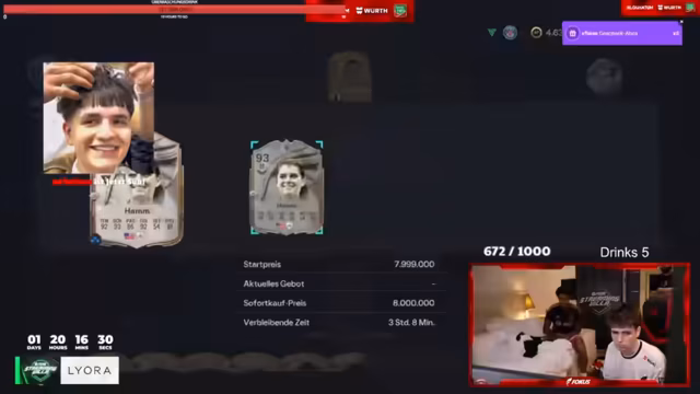 15:50:58Im Stream wird über hohe Spielstände und Transfererlöse gesprochen. Ein Spieler hat offenbar 33 Millionen Coins, während andere, wie der Streamer selbst, mit 13 Millionen versuchen, weiterzukommen. Es gibt auch eine Erwähnung von Verkäufen, wobei ein Spieler übertrieben viele Coins verkauft hat und dadurch Einschränkungen erhielt. All dies deutet auf einen intensiven Handel und Währungsumlauf im Spiel hin.