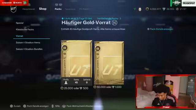06:54:21Nach dem Öffnen diverser FC 26-Packs, insbesondere eines 100k-Packs, erzielt der Streamer einen Gewinn mit Patrick Pajor, was zur Wiederholung von 'Patry 100k' führt. Später wird ein Verlust mit dem Hansen-Pack beklagt. Beim Draft-Modus treten Verluste auf, und es wird über ausstehende Wetten gesprochen, wie eine 10-Sub-Wette auf ein United-Spiel. Der Fokus liegt auf den finanziellen Auf und Ab sowie den emotionalen Reaktionen auf die Ergebnisse der Pack- und Draft-Sessions.