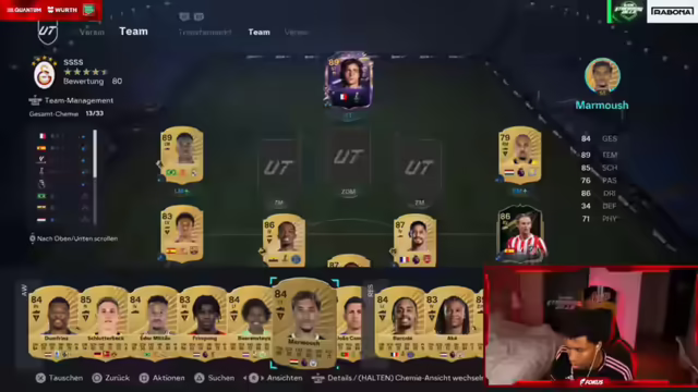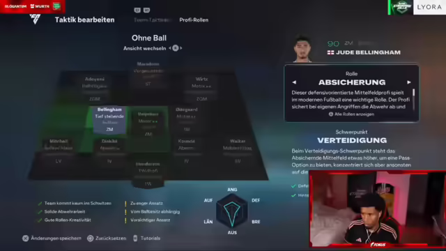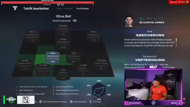 01:16:06Der Streamer präsentiert sein Draft-Team und diskutiert Taktiken. Er hat Geist gezogen und spielt 4-4-1-1. Es wird über den defensiven Ansatz gesprochen, ob die Höhe 90 riskant ist. Es wird diskutiert, ob Absicherung oder tiefstehender Motor auf Viehra gesetzt werden soll. McAllister ist neben ihm. Innensturm plus plus. Die Nase ist zu. Bera ist stark. Es steht 5-4 in der ersten Halbzeit. Der Streamer ist in der ersten Runde des Drafts. Er ist eher ein Fan von Offensiv-Fußball. Patrick Vera hat den Ball. Der Streamer leakt etwas. Es wird diskutiert, warum jemand kein Fußball schaut, weil FIFA wichtiger ist. Mit dieser Mentalität kann man kein Profi werden. Es wird über die Verteidigung gesprochen, dass man nach vorne verteidigen muss. Es steht 6-6. Der Streamer war auf Verlegerung. Florian Würz mit einem Trickschuss. Der Monitor ist zu hell.