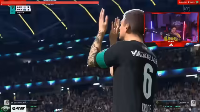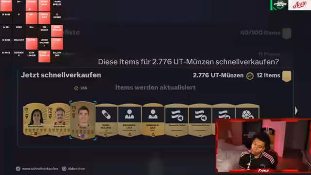11:42:45Streamer äußert seine Frustration über den FIFA-Markt und Spielerbewertungen. Er erwähnt, dass er 240.000 Punkte in einem einzigen Tag geöffnet hat, aber mit den Ergebnissen unzufrieden ist. Er kritisiert EA Sports, weil schnelle Spieler wie Kai Havertz plötzlich überdurchschnittliche Geschwindigkeit (EV) erhalten könnten. Er betont, dass 20.000 Punkte für das Weekend League-Wochenende ausreichen und das Aufladen von Coins unnötig ist.