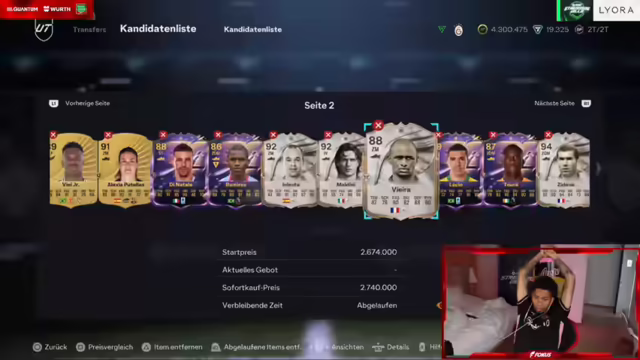 02:39:16Es wird über die Qualität verschiedener Spieler im Spiel diskutiert, insbesondere Yaya Touré, die als beste Spielerin hervorgehoben wird, obwohl sie nur ZDM spielen kann. Es wird über den Preis von Ginola spekuliert, der gerade fällt, und überlegt, ob er für 3 Millionen Coins gekauft werden soll. Der Fokus liegt auf dem Beobachten von Preisentwicklungen und dem Erkennen von Gelegenheiten zum Flippen von Spielern, wie im Beispiel von Werder Bremen. Es wird überlegt, ob man wieder bei Werder einsteigen soll, aber davor gewarnt, da zu viele Zuschauer den gleichen Tipp bekommen könnten. Es wird überlegt, in Valverde zu investieren, da er als zu günstig angesehen wird. Es wird über die Performance von Ryan Daz diskutiert, der als bester Mittelfeldspieler der Welt bezeichnet wird. Es wird überlegt, ob man R9 für 11 Millionen hätte kaufen sollen, wenn Valverde nicht verfügbar gewesen wäre. Es wird über die Icon-Preise vom letzten Jahr gesprochen und betont, wie wichtig diese Informationen sind. Es wird überlegt, ob man Packs kaufen soll, obwohl keine Coins vorhanden sind. Es wird über die erste Weekend League in 13 Tagen gesprochen und die eigene Heiserkeit beklagt.