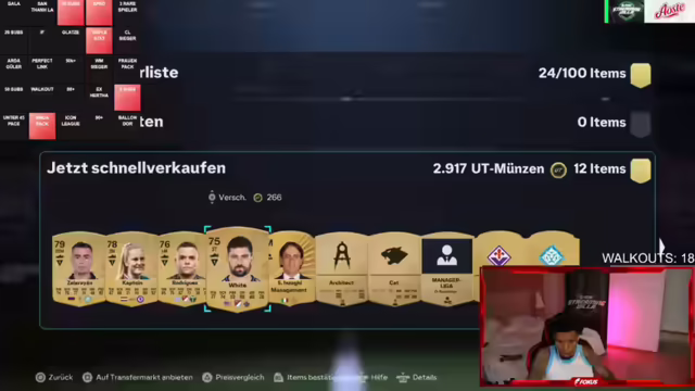 01:48:37Es wird über die Preise im Spiel diskutiert, insbesondere Vinicius. Es wird überlegt, was man macht, wenn man beim Bingo gewinnt und ob man pro Bingo 10 Subs an den anderen gibt. Der Goat Marco Reus wird erwähnt. Es wird gleichzeitig mit dem Chat angefangen zu spielen. Ein Ex-Hertha-Spieler wird im Pack gezogen. Es wird überlegt, ob Rente für 400k gut ist. Theo Hernandez wird gezogen und kommt direkt ins Team. Das Ninja Pack wird als "krank" bezeichnet. Es wird über Ousmane Dembélé gesprochen, der in drei Stunden 800.000 plus gemacht hat. Es wird erklärt, wie man das Bingo im Stream einbindet. Der Chat wird aufgefordert, aufzupassen und zu helfen. Es wird überlegt, ob man die letzten fünf Minuten des Streams speichern kann, um nichts zu verpassen. Es wird festgestellt, dass es kompliziert ist, auf alles zu achten. Es werden verschiedene Elemente des Bingos abgehakt, wie z.B. fünf Subs, Glatze und unter 45 Pace. Es wird überlegt, ob man pro Spieler nur eins abhaken darf. Es wird festgestellt, dass Easy gut gegen Barca war. Der Hamster wird für die Serverprobleme verantwortlich gemacht. Es wird überlegt, wie teuer Lazaro ist. Santanla wird als einfach bezeichnet. Es wird festgestellt, dass es schlimm ist, nicht aus den Packs rauszukommen. Es wird überlegt, ob man Spieler verkaufen oder warten soll.