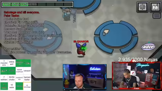 07:32:55Die Spieler diskutieren über das Quitten im Spiel, wobei ein Spieler als 'Bastard-Move' bezeichnet wird. Es wird erwähnt, dass es nicht das erste Mal ist, dass Spieler nach ihrem Tod quitten. Eli ist wütend auf Eldos wegen seines Quits. Ein Spieler wird abgestochen, ohne sich zu wehren. Die Spieler versuchen, Mehdi zu eliminieren, da er als Bedrohung wahrgenommen wird. Es kommt zu Verwirrung über den Report-Button und die Möglichkeit, einen Kill zu landen. Ein Spieler gesteht, einen Kill vergessen zu haben und lobt Rose für ihren Spielzug. Die Spieler hoffen, nicht eliminiert zu werden und fordern Kroko auf, aus Ehre zu voten. Die Diskussion über das Quitten geht weiter, wobei ein Spieler seine Entscheidung verteidigt, da er keinen Kill gemacht hatte und es dumm war, Schradin rauszuvoten. Die Spieler fragen sich, warum sich die Imposter nicht gegenseitig anschreien und ein Spieler prahlt damit, alle Kills gemacht zu haben.