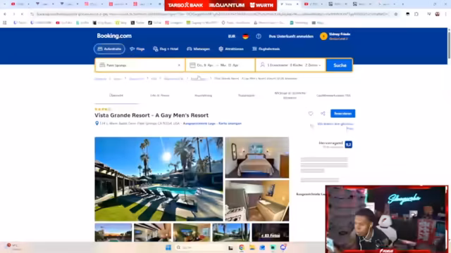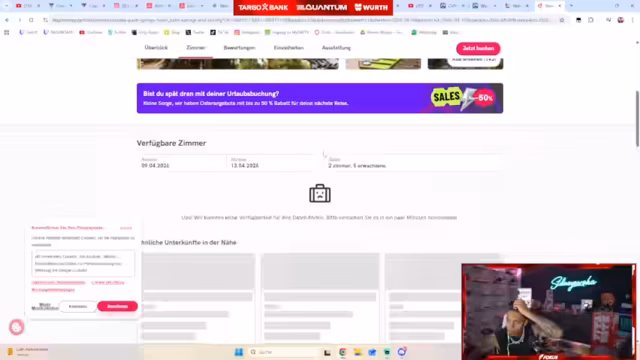 01:39:20Der Stream konzentriert sich zunächst auf die Hotellsuche für Palm Springs vom 9. bis 13. August. Nachdem der ursprüngliche Vorschlag fälschlicherweise nach Alabama wies, wird die Suche neu gestartet. Auf Trivago stößt der Streamer auf ein Problem: Das Renaissance Hotel ist ausgebucht. Daraufhin wird nach Alternativen wie einem Motel 6 gesucht, was jedoch mit nur zwei Sternen nicht den Vorstellungen entspricht. Auch das sogenannte "Gay Resort" scheint plötzlich nur noch zwei Sterne zu haben, was aus der Auswahl fällt und die Verwirrung über die Qualität der verfügbaren Unterkünfte verstärkt.
