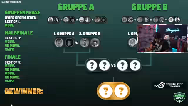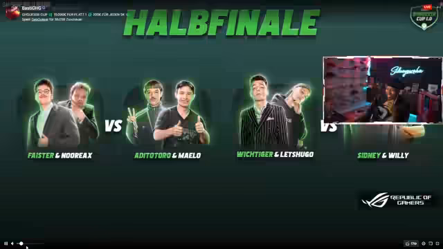 02:15:11Die Vorrunde des Cups neigt sich dem Ende zu, und die Stände werden eng. Das Streamer-Team Sidney und Willi muss nun gegen Adi und Maedo antreten. Der Druck ist hoch, da ein Sieg entscheidend für den Einzug in die nächste Runde sein könnte. Das Streamer-Team verliert knapp, zeigt aber eine starke Leistung und bleibt im Wettbewerb. Parallel dazu laufen andere Entscheidungsspiele, bei denen über Plätze und mögliche Einnahmen gestritten wird. Die Atmosphäre ist gespannt, da die Ergebnisse unmittelbar die further Teilnahme und den Sieg von 200 Euro beeinflussen.