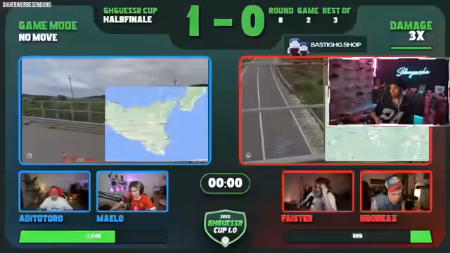 04:50:34Das Finale startet. Die beiden Teams, Sidney & Willi und Adi & Maelo, messen sich nun direkt. Es ist ein Duell auf Augenhöhe, bei dem beide Seiten starke Leistungen zeigen. Die Einstimmung im Chat ist hoch, und es wird über Favoriten und Gewinnchancen diskutiert. Das Finale ist ein globales Ereignis und eine große Nummer für die GeoGuessler-Szene.
