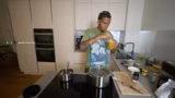 01:08:08Während die Suppe fertig wird, bereitet Sidney das Fufu zu. Er misst dafür einfachen Kartoffelbrei und Grieß im Verhältnis 1:1,5 an. Die Masse wird warm gerührt, bis eine feste, breiige Konsistenz entsteht. Zum Servieren wird das Fufu mit der Egussi-Suppe, dem gegarten Hähnchen und dem Shaki serviert, das man sich traditionell mit der Hand nimmt.
