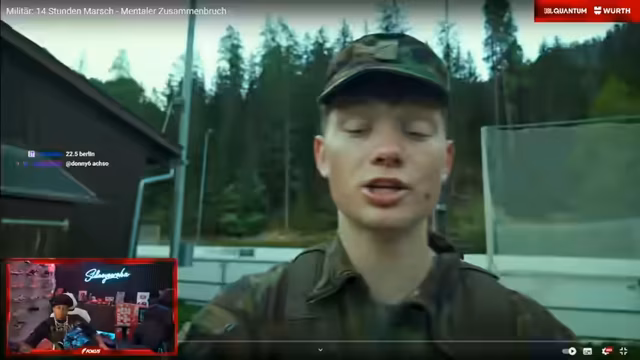 04:57:14Nach einem kurzen Ausflug in den Fußball wurde zu einem militärischen Thema gewechselt. Es ging um einen sehr anstrengenden Bundeswehr-Marsch von 50 Kilometern mit 1.200 Höhenmetern. Der Streamer beschrieb das fatale Erlebnis einer Verletzung, nachdem er von einem Kollege in die Hoden geschlagen wurde. Er erzählte vom Marschbeginn im Dunkeln, dem kalten Schweinetransporter und den extremen physischen und mentalen Herausforderungen, die bevorstehen.
