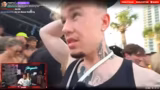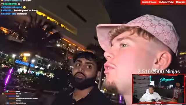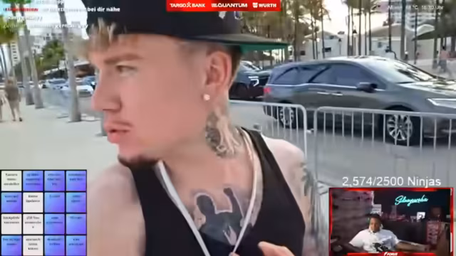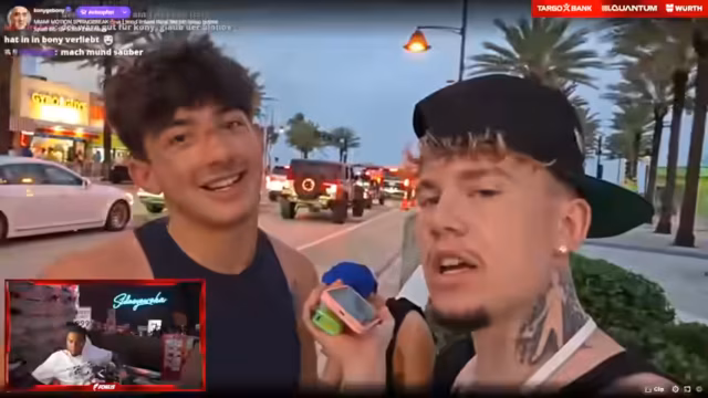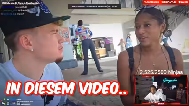 05:09:48Der Streamer interagiert mit Passanten auf der Straße. Er spricht mit einer Person namens Connie Gaboni, stellt sich selbst als 'Asian Jeff' vor und unterhält sich auf Deutsch. Er erwähnt seine Followerschaft und seine Mission, 'der größte Superstar in Amerika' zu werden. Dabei film er seine Umgebung und versucht, Gespräche zu initiieren, was auf eine Mischung aus Performance und spontaner Street-Reportage hindeutet.