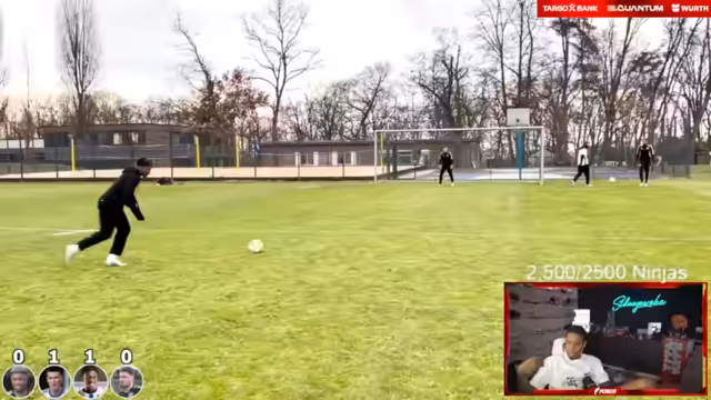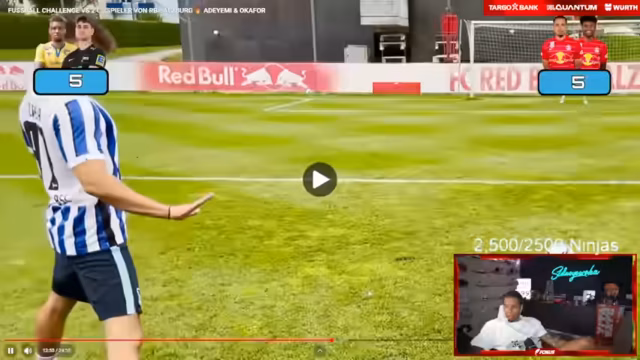 01:33:00Der Höhepunkt des Streams ist ein Special-Event: Der Streamer und sein Team 'Frippenfriede' treten gegen zwei Profis von Red Bull Salzburg, Harry Krammer und Karim, in einer 2-gegen-2-Challenge an. Dabei werden verschiedene Schüsse aus unterschiedlichen Entfernungen absolviert. Es wird deutlich, wie schwer es ist, gegen den Profi-Torwart Nico zu treffen, und die Herausforderung für beide Teams besteht darin, auch unter Druck präzise Schüsse zu platzieren. Das Event soll auf Instagram 100.000 Likes erhalten.