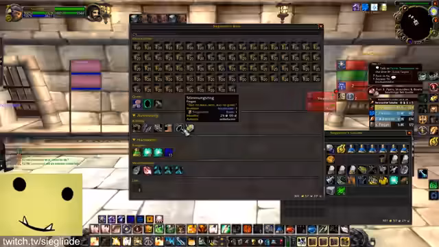 11:59:03Die Streamerin gibt nach einem Hinweis zu, mit Scams Gold zu verdienen, da sie Bahnfächer benötigte. Sie fühlt sich süchtig danach. Sie klagt über ihr überfülltes Inventar, das sie stark überfordert und den Spielfluss stört. Sie versucht, Platz zu schaffen, indem sie Gegenstände wegwirft und über die Bedeutung von Item-Management spricht.