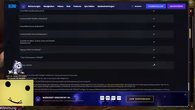 11:08:29Während des Streams wird ein Angebot von Blizzard als Sponsor für World of Warcraft Midnight angekündigt. Dies ermöglicht es dem Streamer, den neuen Inhalt trotz bereits langer Spielzeit vorzustellen. Die Belohnungen, die über den Sponsoring-Link erhältlich sind, werden aufgelistet, darunter ein 80er Boost, 30 Tage Spielzeit, Haustiere und Mounts. Auch die neuen Features der Erweiterung wie die Verfolgungsjagd, die neue Demon Hunter-Spezialisierung und die überarbeiteten Zonen werden vorgestellt und beworben.