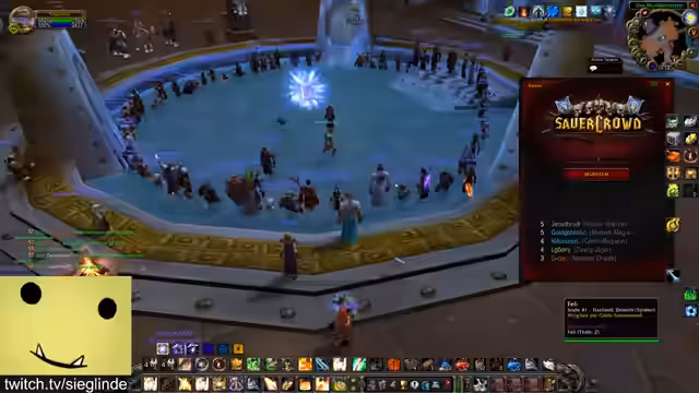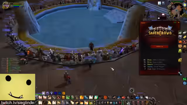 08:24:26Das Deathroll-Event beginnt. Ein Teilnehmerkreis wird rund um einen Brunnen gebildet, und eine bestimmte Person startet mit der Wahl einer Zahl zwischen 2 und 1000. Die Teilnehmer würfeln reihum, bis jemand eine 1 würfelt und scheidet aus. Der Gesamtpot beträgt 510 Gold. Der Gewinner darf das Geld im Auktionshaus für Gegenstände seiner Wahl ausgeben, was für zusätzliche Spannung sorgt.