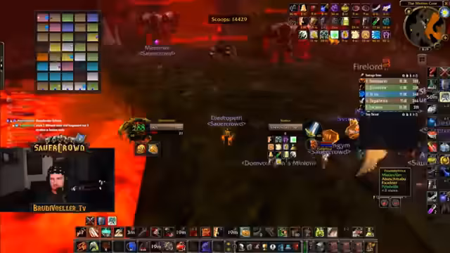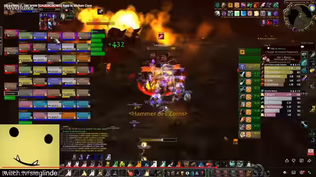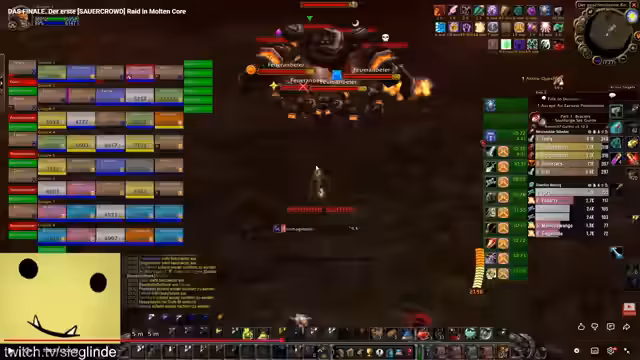 10:49:00Die Gruppe startet den Raid und muss sich zunächst neu orientieren. Es kommt zu Disconnects und Todesfällen, weshalb die Streamerin ein Ready-Check durchführt. Anschließend zieht die Gruppe in den Kernbereich von Molten Core ein und konzentriert sich darauf, alle Mitglieder sicher zu versammeln. Die erste Aufgabe ist der Kampf gegen feuerumwobene Wächter, bei denen die Disziplin der Gruppe getestet wird. Besonders der Umgang mit der Lava im Raum stellt eine ständige Gefahr dar und erfordert erhöhte Aufmerksamkeit von allen Mitgliedern.