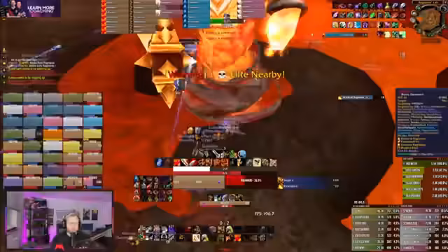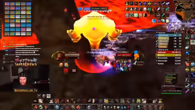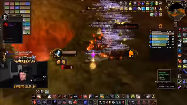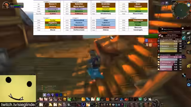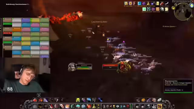 13:38:47Bevor der finale Bosskampf beginnt, werden die Positionen für Ragnaros festgelegt. Die Tank- und Melee-Gruppen stehen nah an der Front, während die Fernkampf- und Heiler-Gruppen sich an der Wand verteilen. Die Melees müssen bei bestimmten Phasen sofort ausweichen, während die Tanks den Haupt-Schaden absorbieren. Der Kampf wird durch einen kritischen Fehler unterbrochen, als ein Spieler unabsichtlich in die Lava springt und stirbt, was einen kompletten Neustart erfordert.
